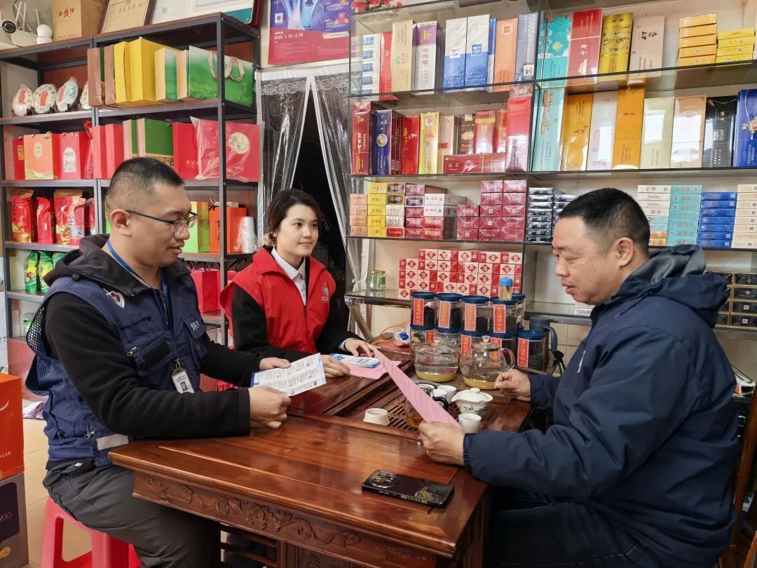 1月17日,惠州仲恺高新区网格员对辖区内商铺进行入户普法宣传。